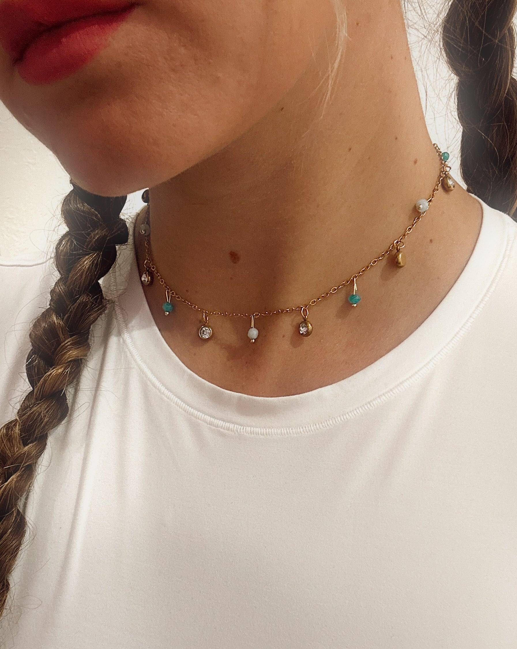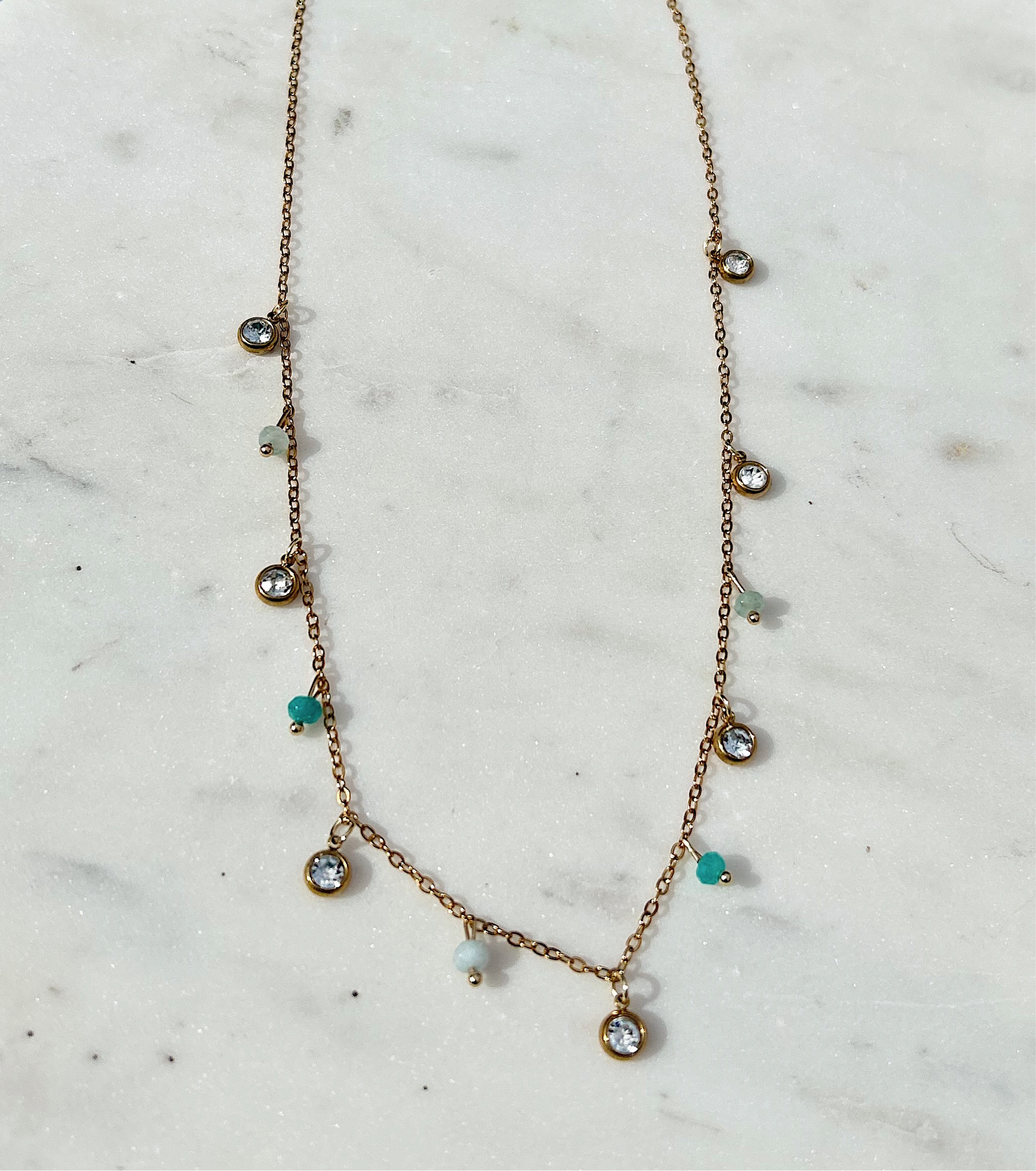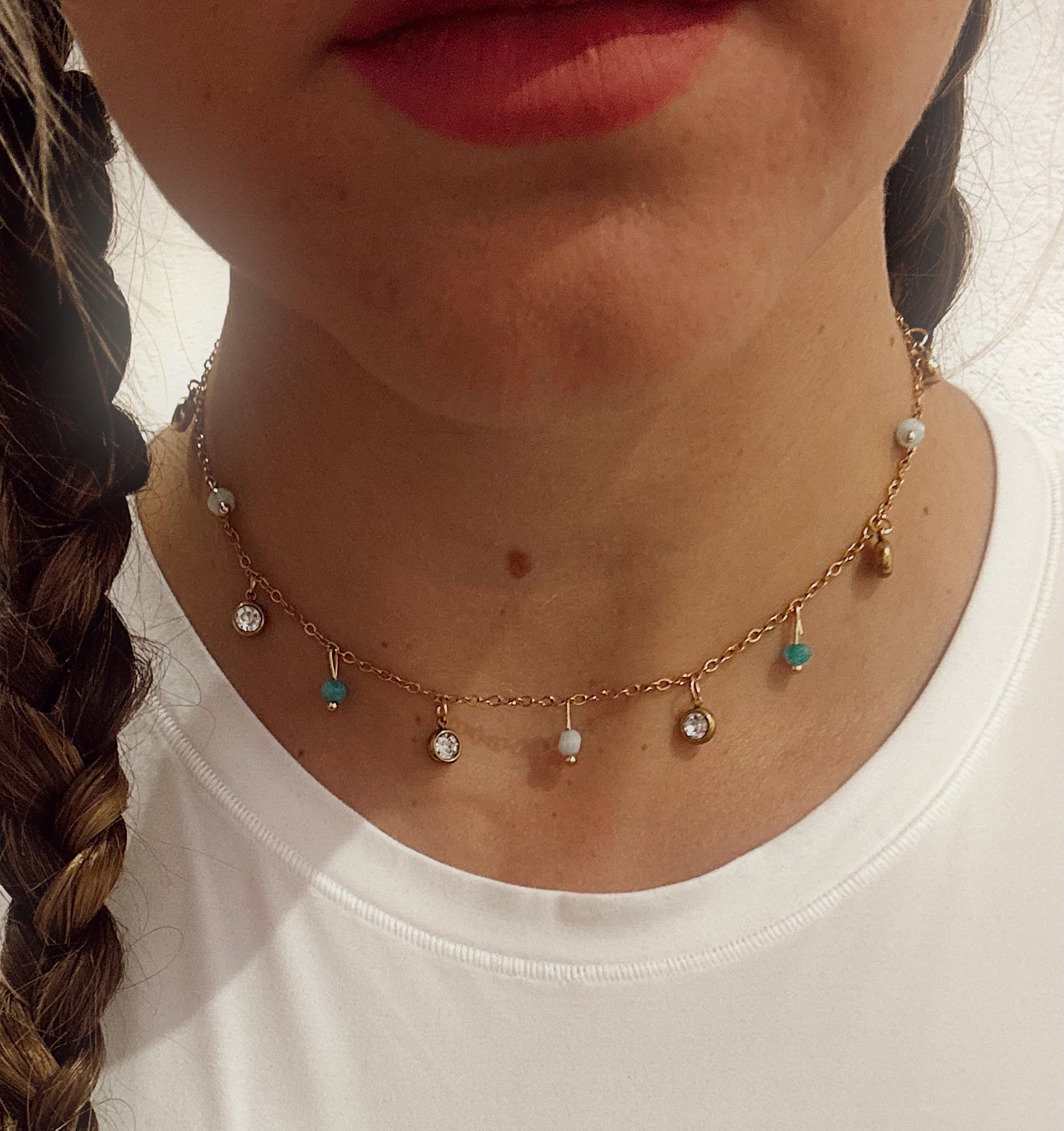 This beaded crystal necklace is made with authentic aquamarine crystals and zirconia crystals. Aquamarine is an amazing stone used for soothing, calming, and stress. Made with hypoallergenic 18k gold plating and stainless steel metals that are non tarnish and suitable for everyday wear. 15” and adjustable to wear as a choker or a longer 18” necklace.