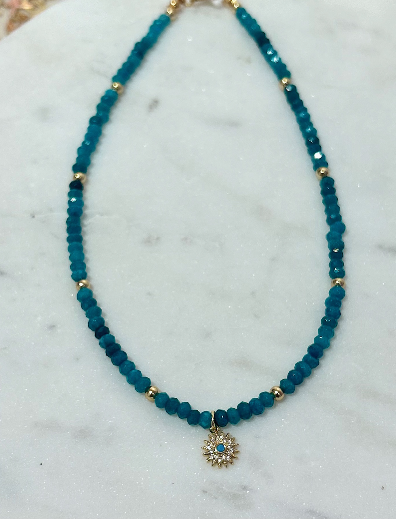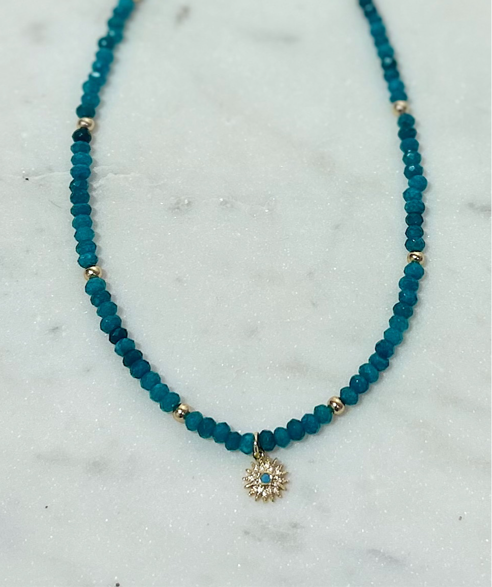 This beaded crystal necklace is made with authentic apatite. This stone is used for calming, manifesting, and discovering your power and truth. Made with hypoallergenic 18k gold plating and stainless steel metals that are non tarnish and suitable for everyday wear. Choose your preferred length below.