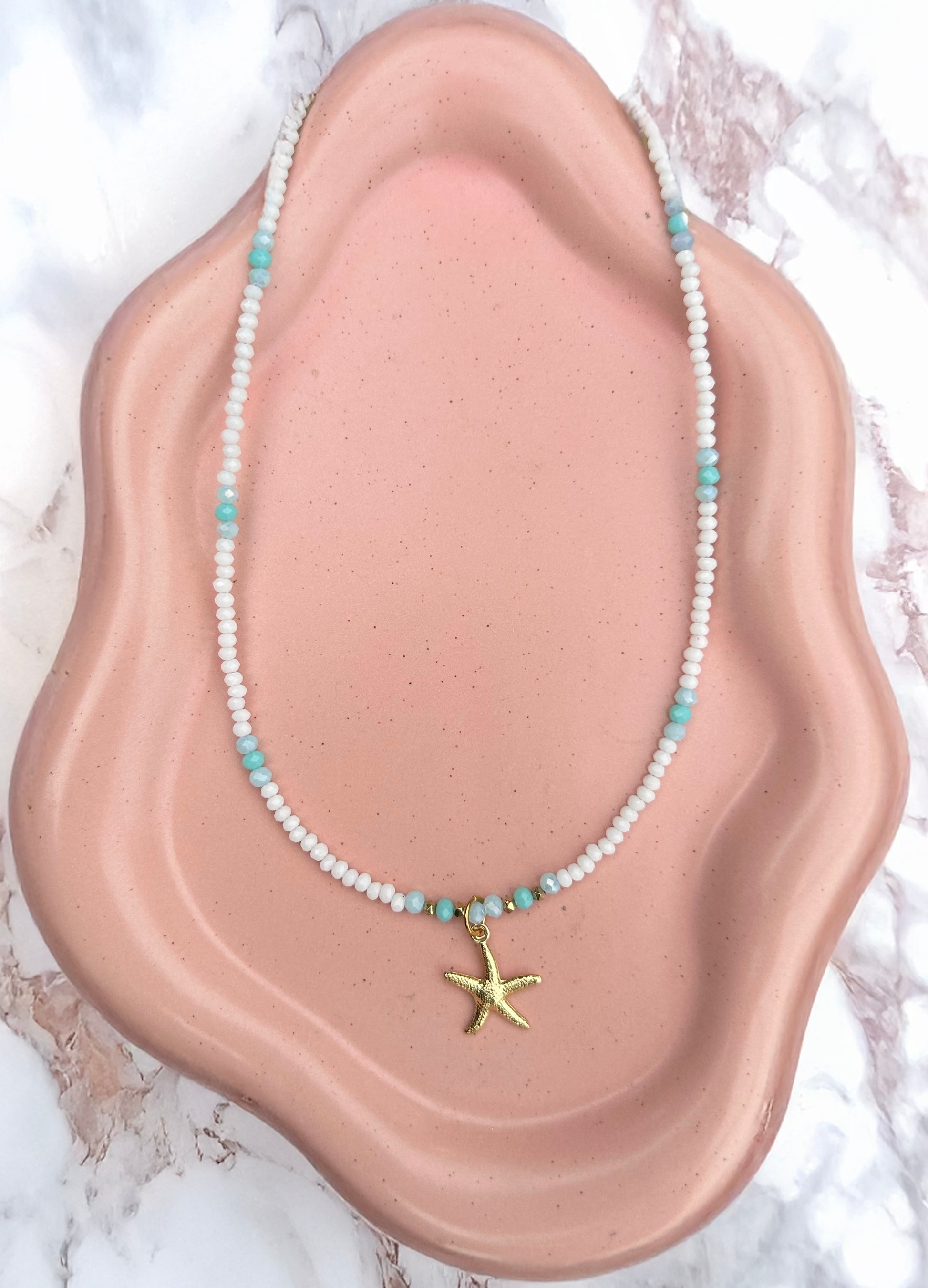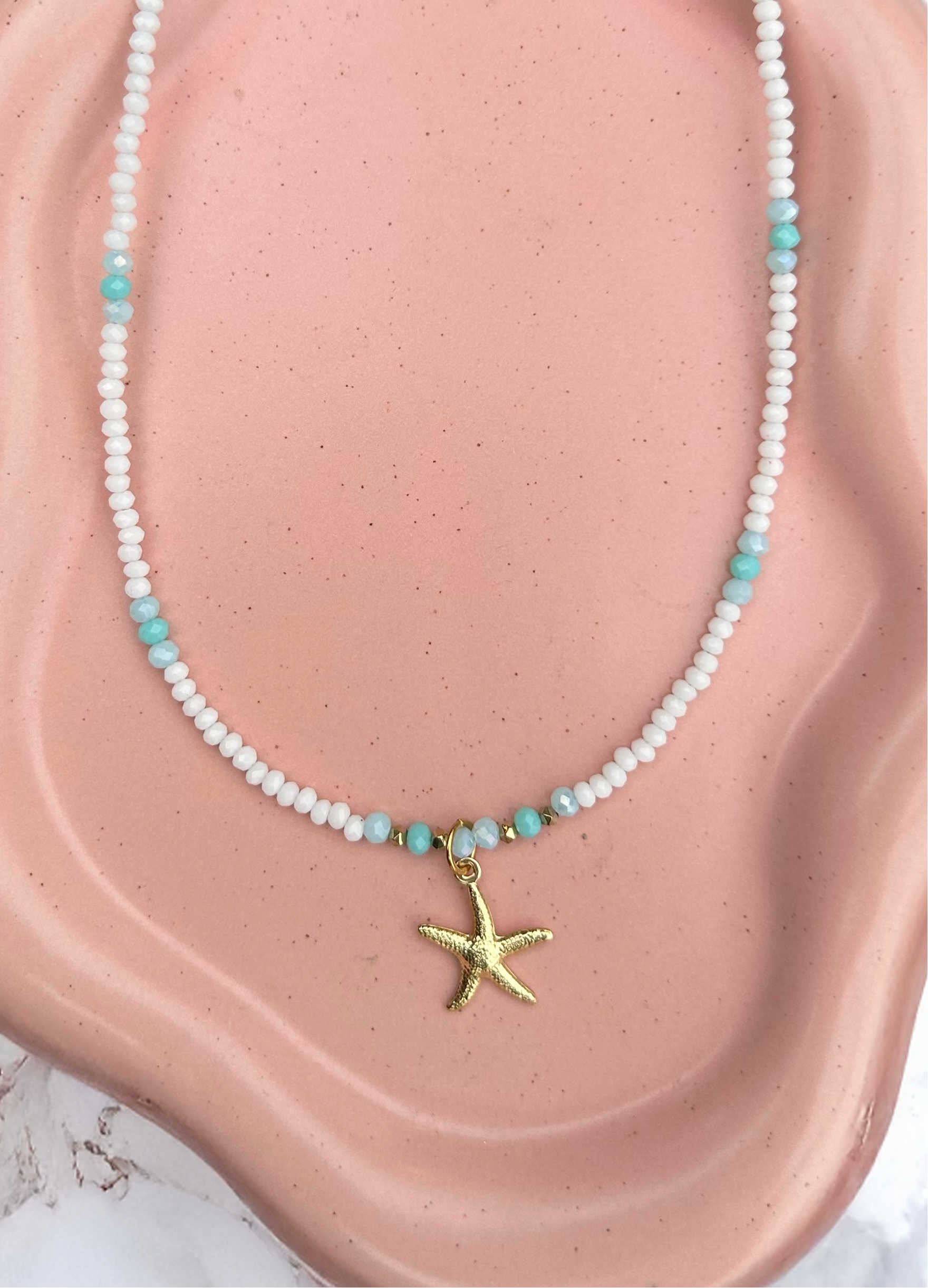 This beaded crystal necklace is made with authentic aquamarine. This stone is used for soothing, calming, and stress. Made with hypoallergenic 18k gold plating and stainless steel metals that are non tarnish and suitable for everyday wear. Choose your preferred length below.