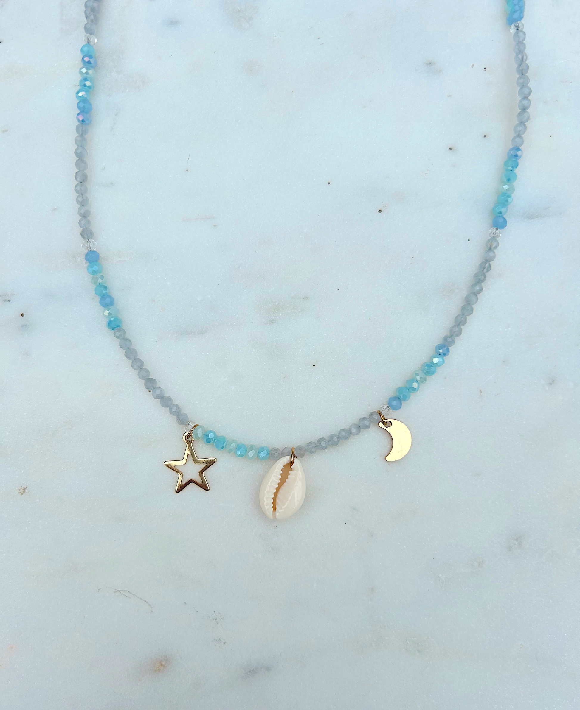 This beaded crystal necklace is made with authentic aquamarine. This stone is used for soothing, calming, and stress. Made with hypoallergenic 18k gold plating and stainless steel metals that are non tarnish and suitable for everyday wear. Choose your preferred length below.
