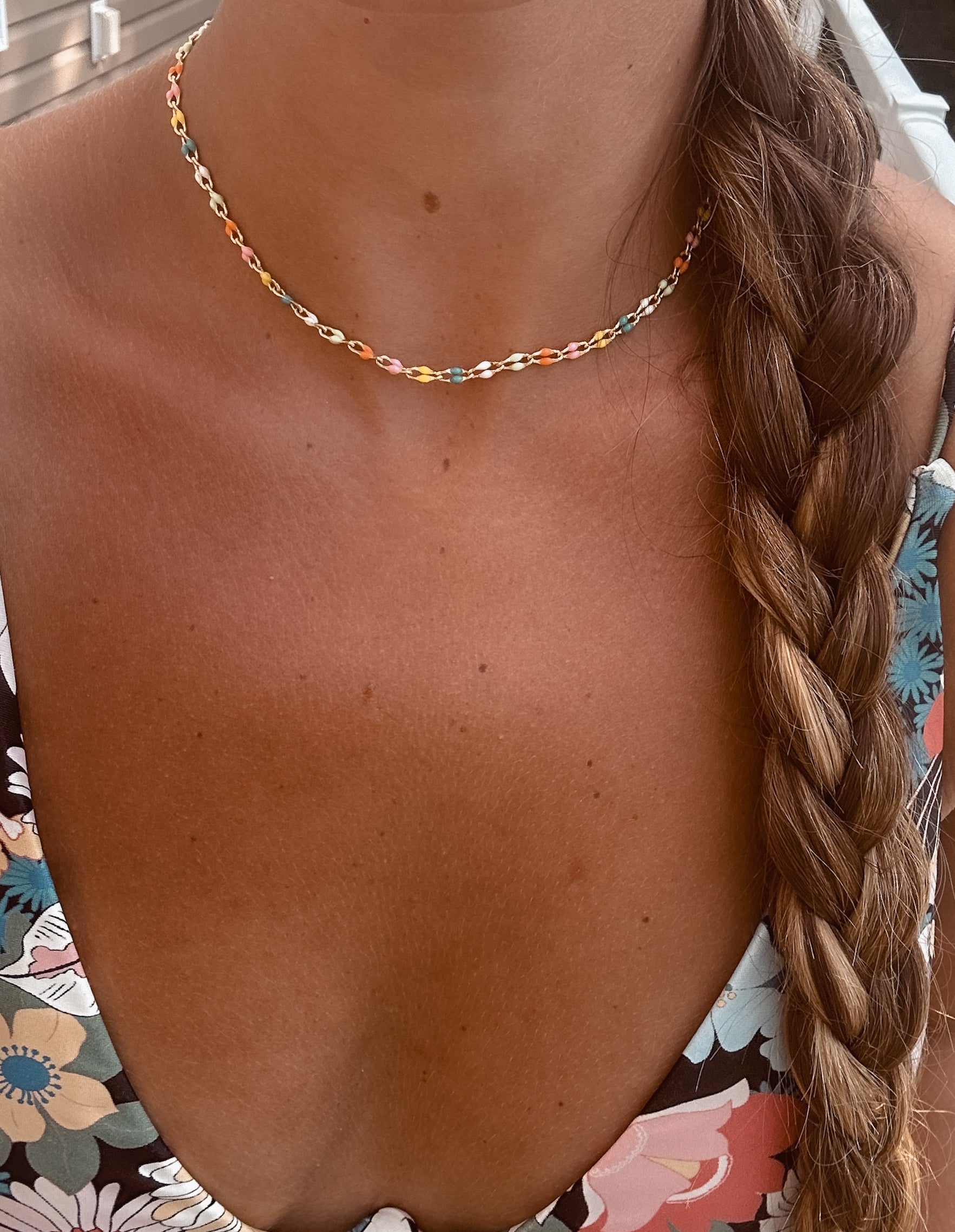 We are obsessed with this chain for beach days! Available as a choker or necklace. 14k gold filled and safe for everyday wear.