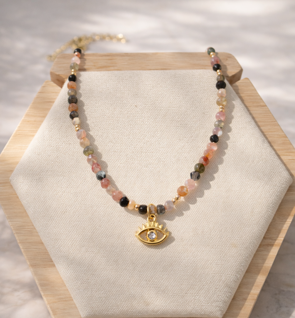 The Good Karma Tourmaline Necklace is designed as a powerful symbol of protection, balance, and positive energy. Featuring natural tourmaline gemstones paired with a delicate evil eye charm, this piece blends meaningful symbolism with effortless everyday style. Tourmaline is known as a grounding stone that helps absorb negative energy while encouraging emotional balance and clarity. The evil eye charm has long been worn as a protective talisman, believed to deflect negativity and invite positive energy into your life. Crafted with 18k gold plated stainless steel, this necklace is hypoallergenic, non-tarnish, and designed for everyday wear. Choose your length below.