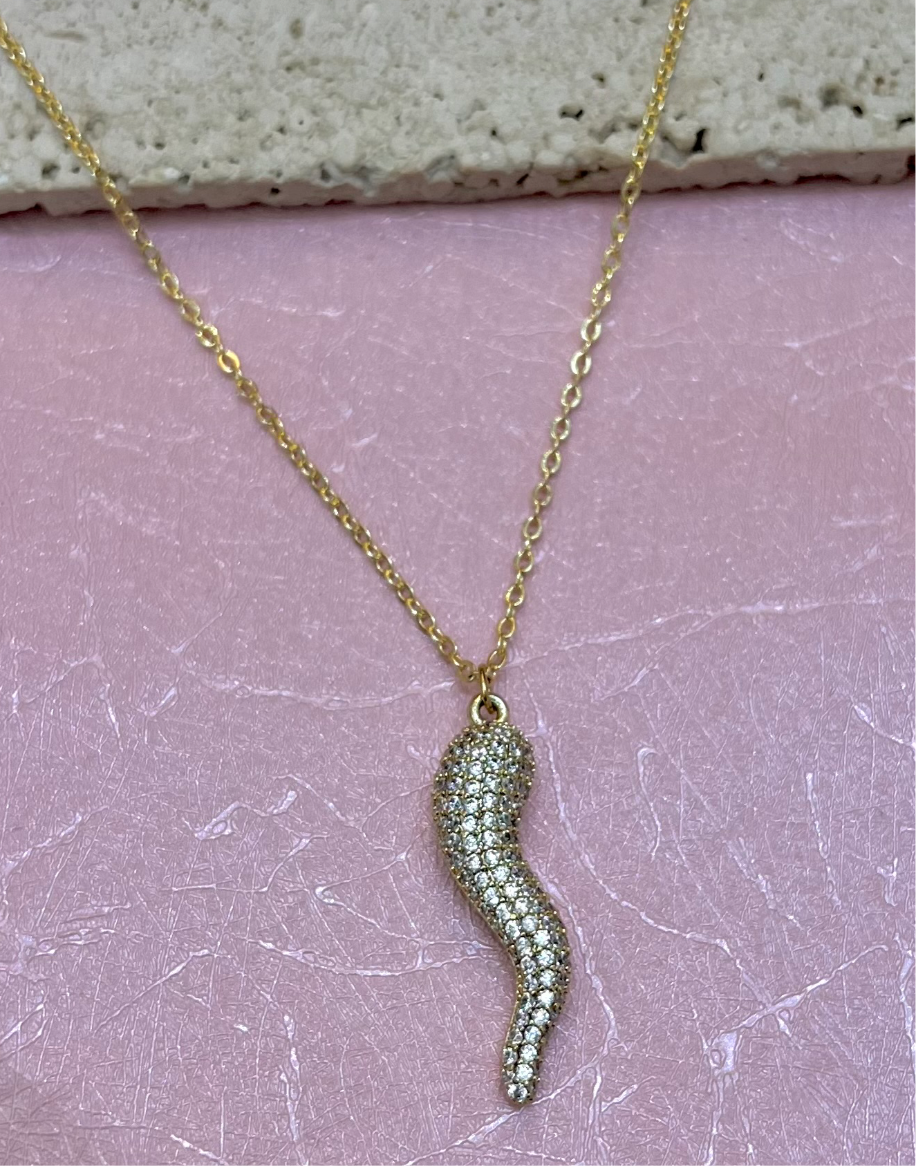 Made with a 14k gold filled cable chain and a zirconia crystal cornicello for good luck. 19” in length.