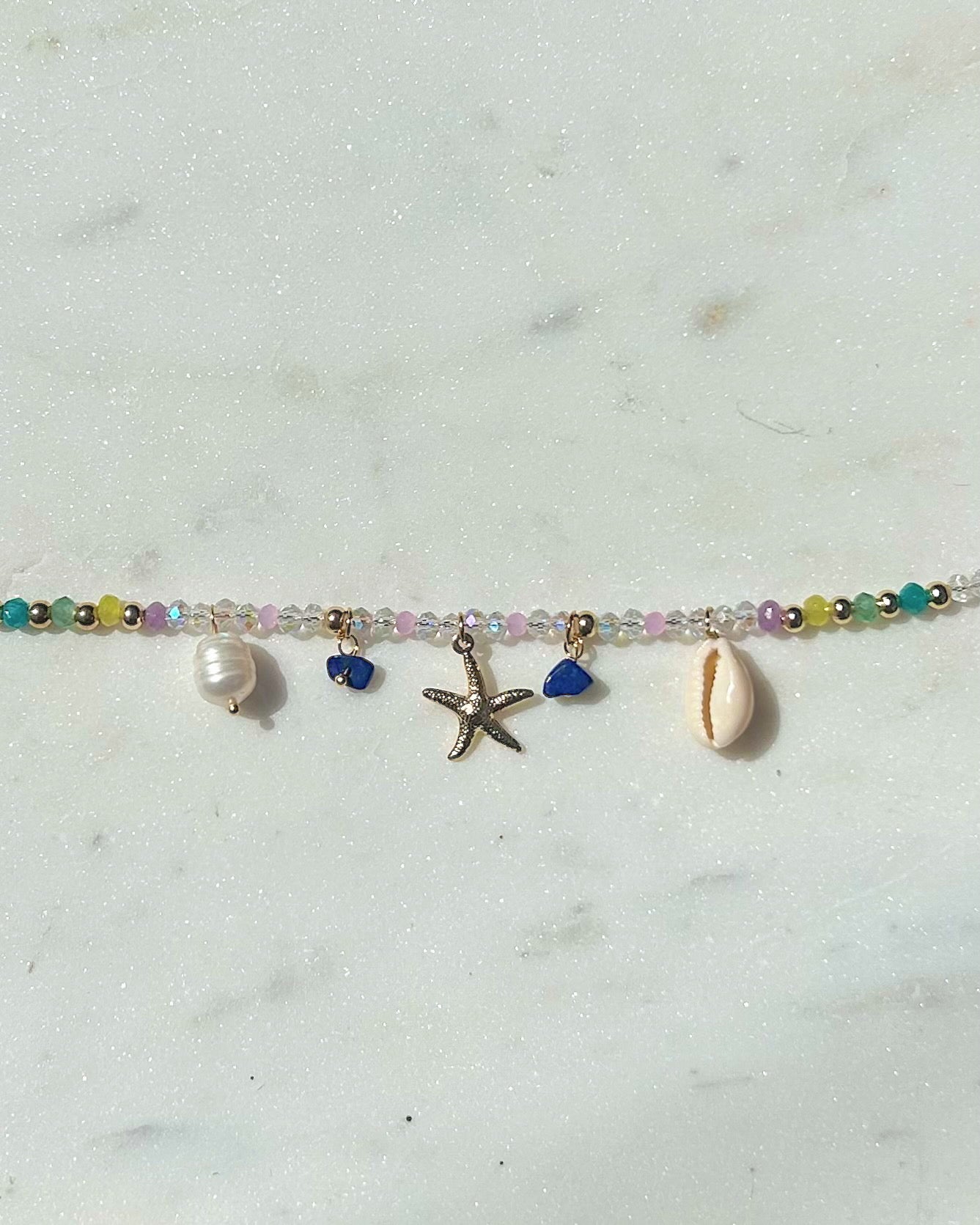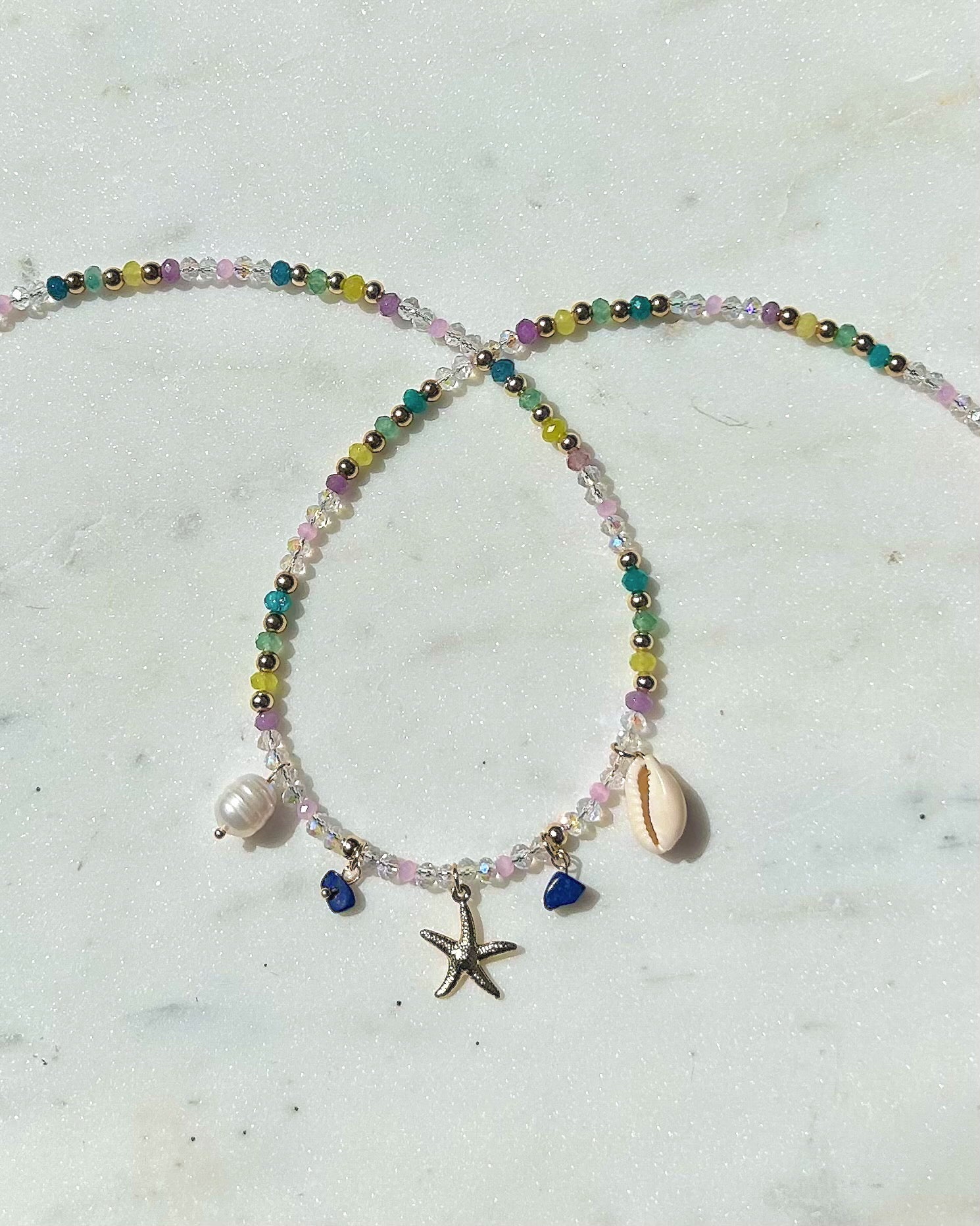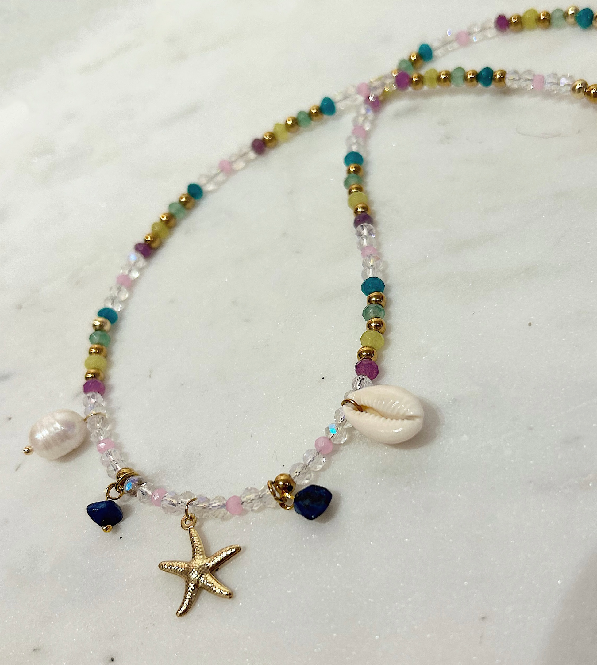 This beaded crystal necklace is made with a mix of authentic crystals such as green aventurine, yellow jade, amethyst, and apatite. Made with hypoallergenic 18k gold plating and stainless steel metals that are non tarnish and suitable for everyday wear. Choose your preferred length below.