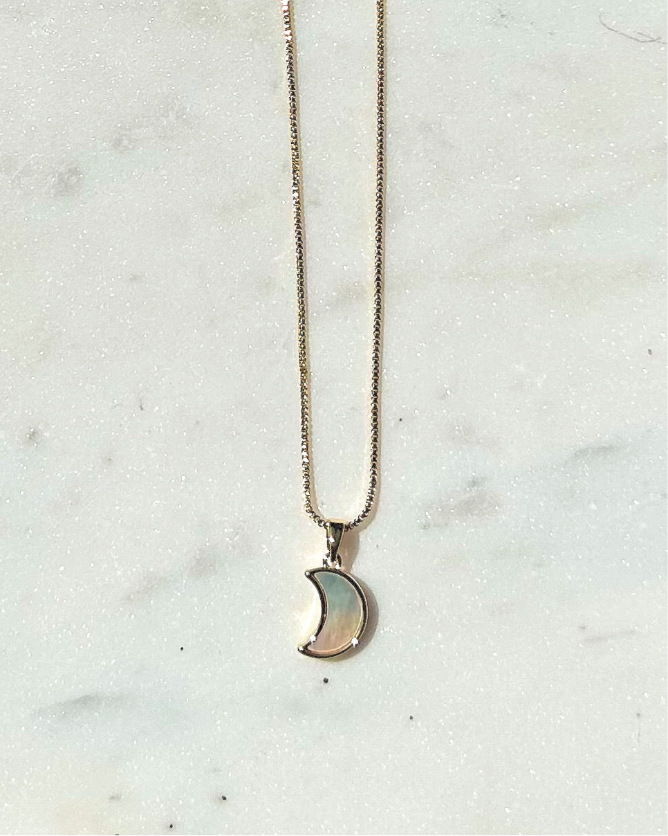 Made with a natural mother of pearl moon pendant and a hypoallergenic 18k gold plated over sterling silver box chain that is non tarnish and suitable for everyday wear. Choose your preferred choker or necklace length below.