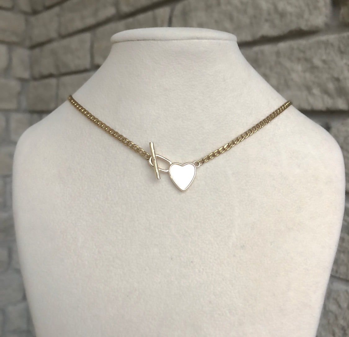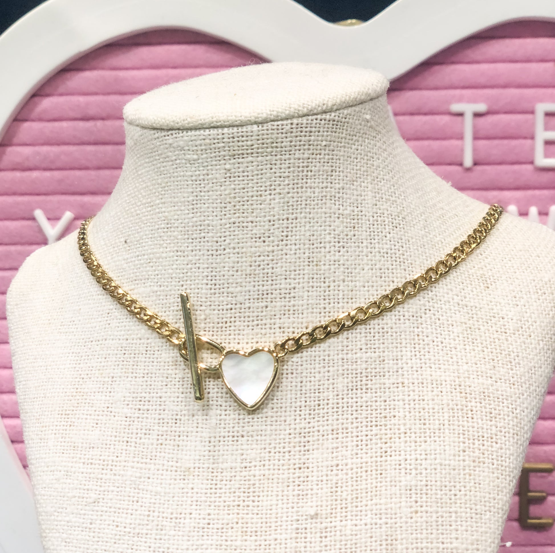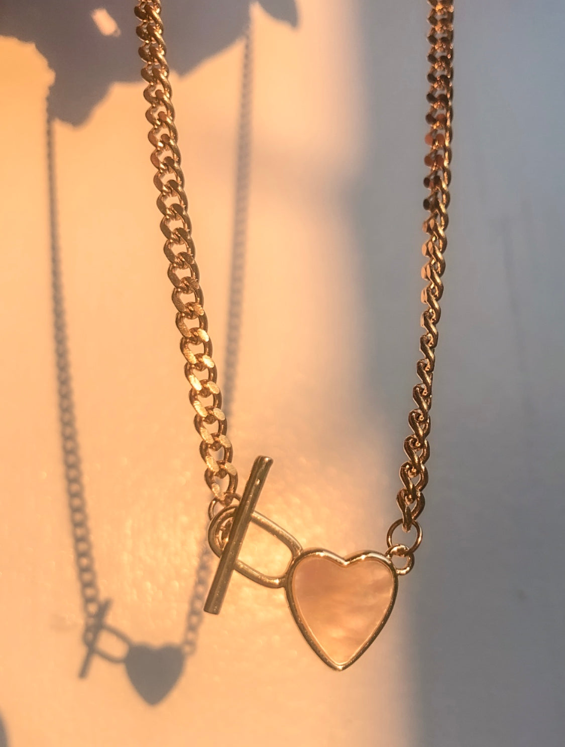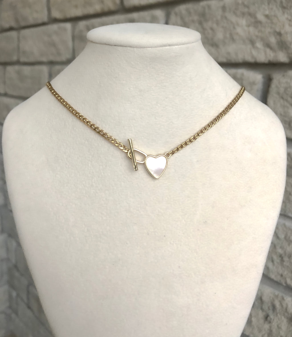 16” in length and made with 18k gold over surgical grade stainless steel. Made with a beautiful natural mother of pearl heart charm.