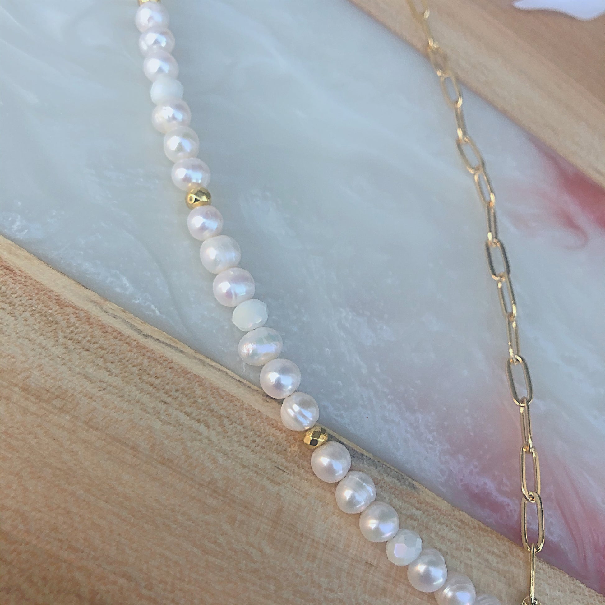 - half 18k gold plated paperclip chain and half freshwater pearls