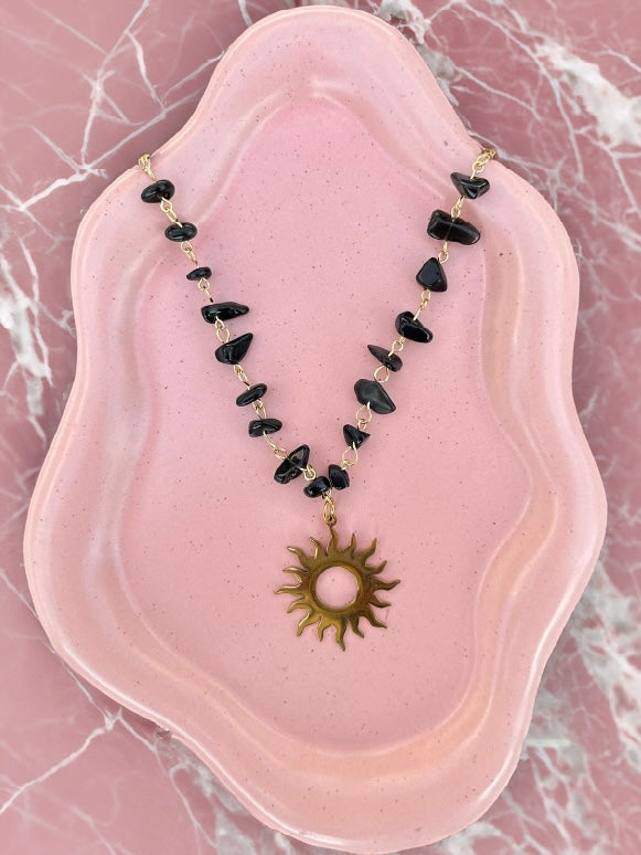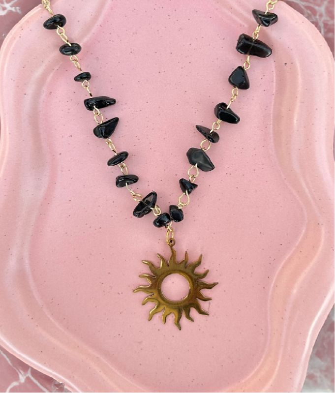 This beaded crystal necklace is made with authentic onyx chip crystals. This stone is known for its protection and negative repelling properties. Made with hypoallergenic 18k gold plating and stainless steel metals that are non tarnish and suitable for everyday wear. 15” and adjustable to wear to 17.5”