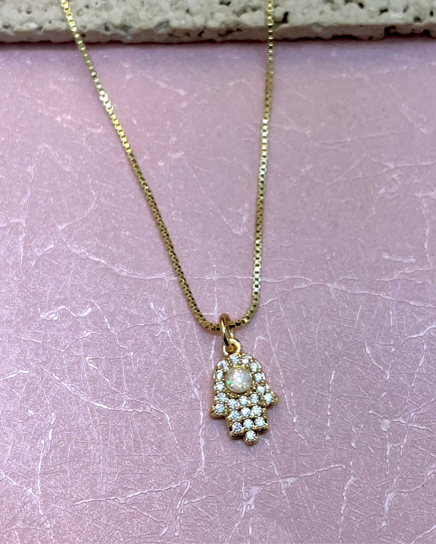 This lucky hamsa amulet necklace is made with an opal crystal in the centre and a zirconia crystal surrounding it. Materials include 18k gold plating over sterling silver. 18” in length.