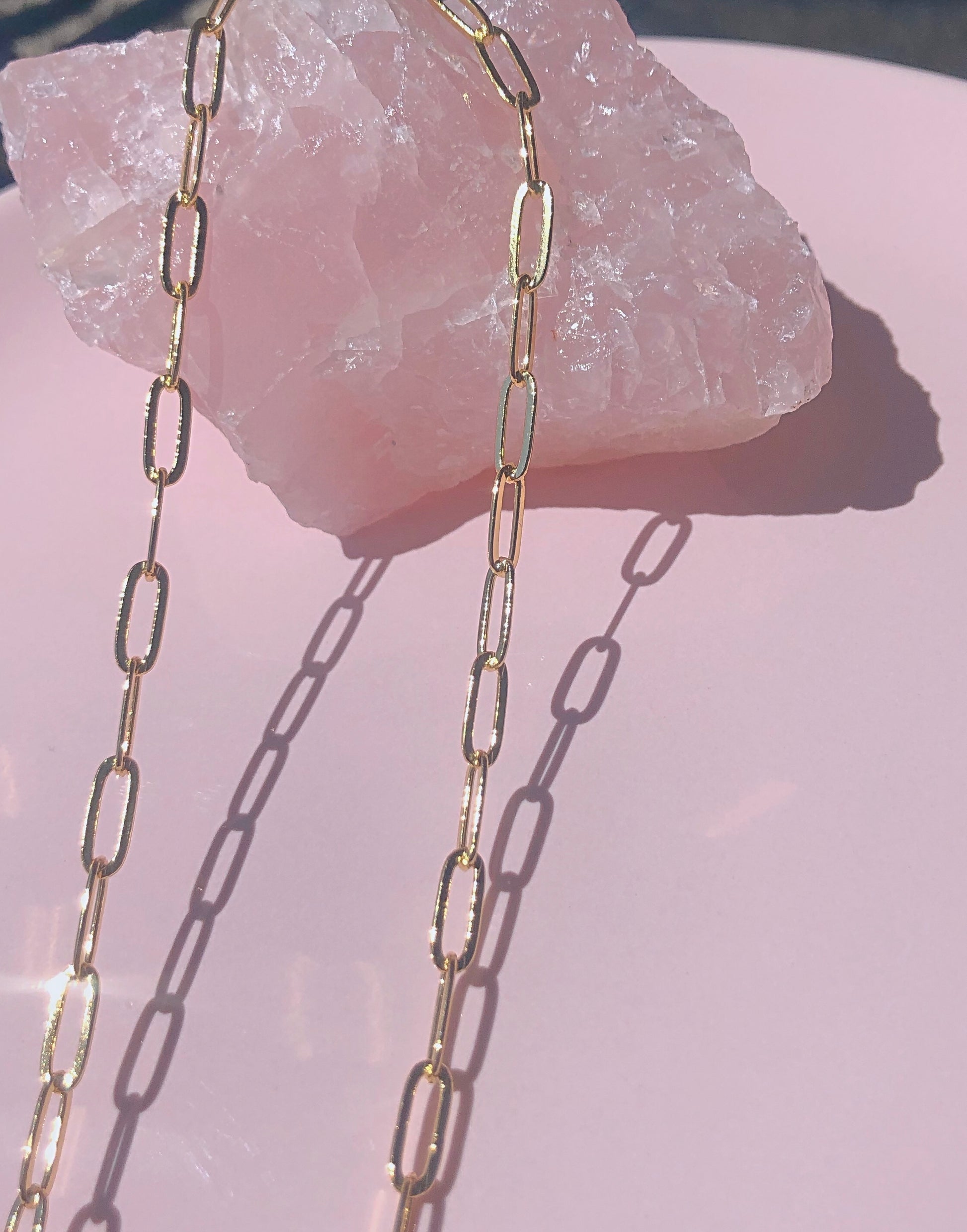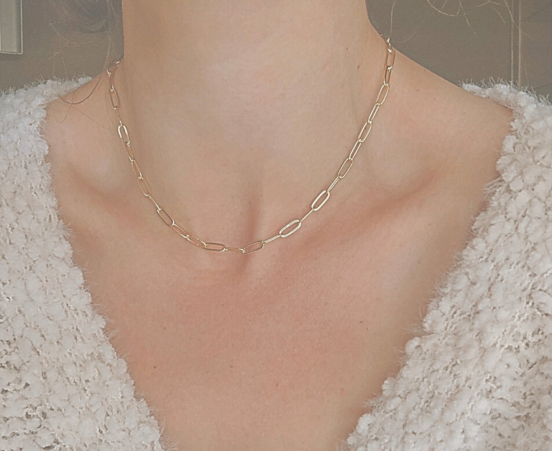 A simple 16” 18k gold and 304 grade stainless steel paperclip chain that works best for layering with longer or shorter pieces.