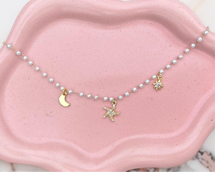Charms: mini gold moon, zirconia small starfish, pink crystal North Star