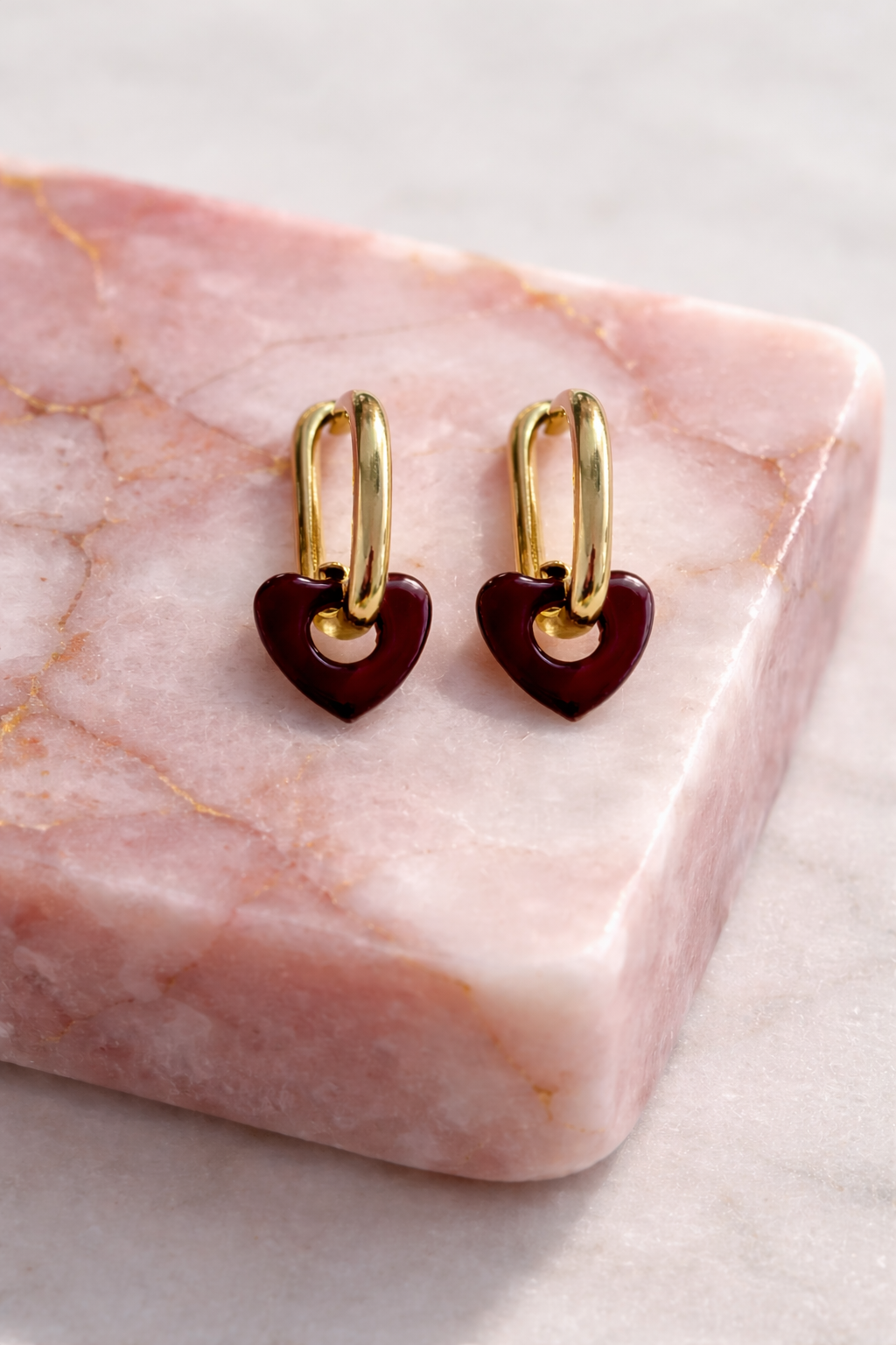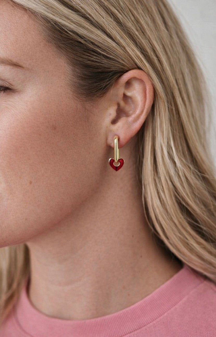 A little bold, a little romantic; the Ruby Heart Huggies are designed to make a statement while staying effortlessly wearable. Featuring a glossy deep-red heart charm suspended from a sleek gold huggie hoop, these earrings bring a touch of vintage romance with a modern edge.