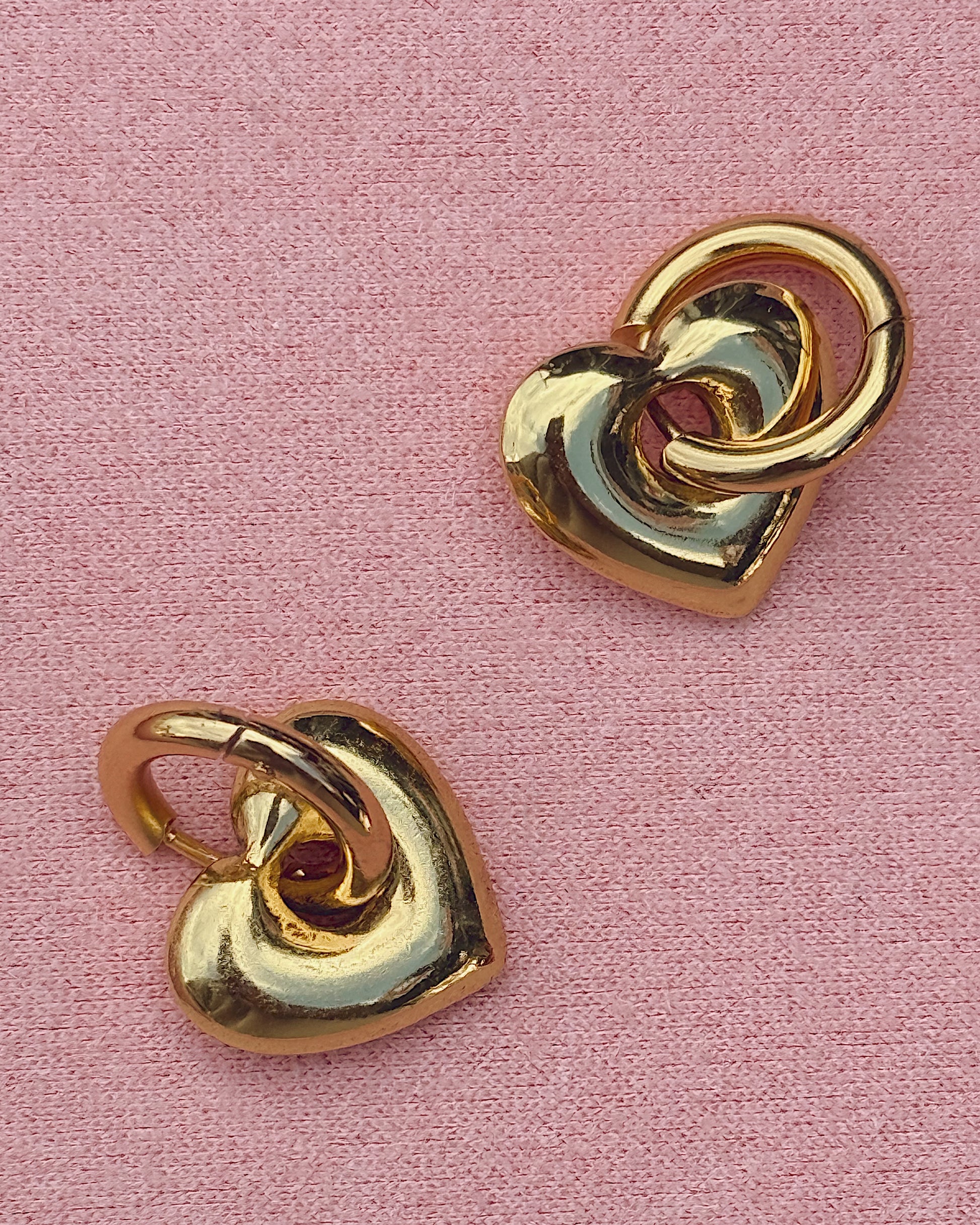 Fall in love with these mini statement earrings — where classic romance meets everyday shine. Featuring puffy gold hearts linked to sleek hoops, they bring the perfect pop of glow to any outfit.