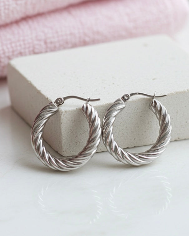 Meet your new everyday statement hoops. Our Twisted Silver Luxe Hoops feature a beautifully sculpted rope-inspired design that adds texture and shine without ever feeling heavy. Crafted from premium stainless steel that’s waterproof, hypoallergenic, and completely tarnish-free, these hoops are made to be worn — from morning meetings to nights out. Elegant yet effortless, they’re the perfect balance of classic and modern. Wear them solo for a clean, polished look or stack them with your favourite studs for a chic layered ear moment. Size: 16mm