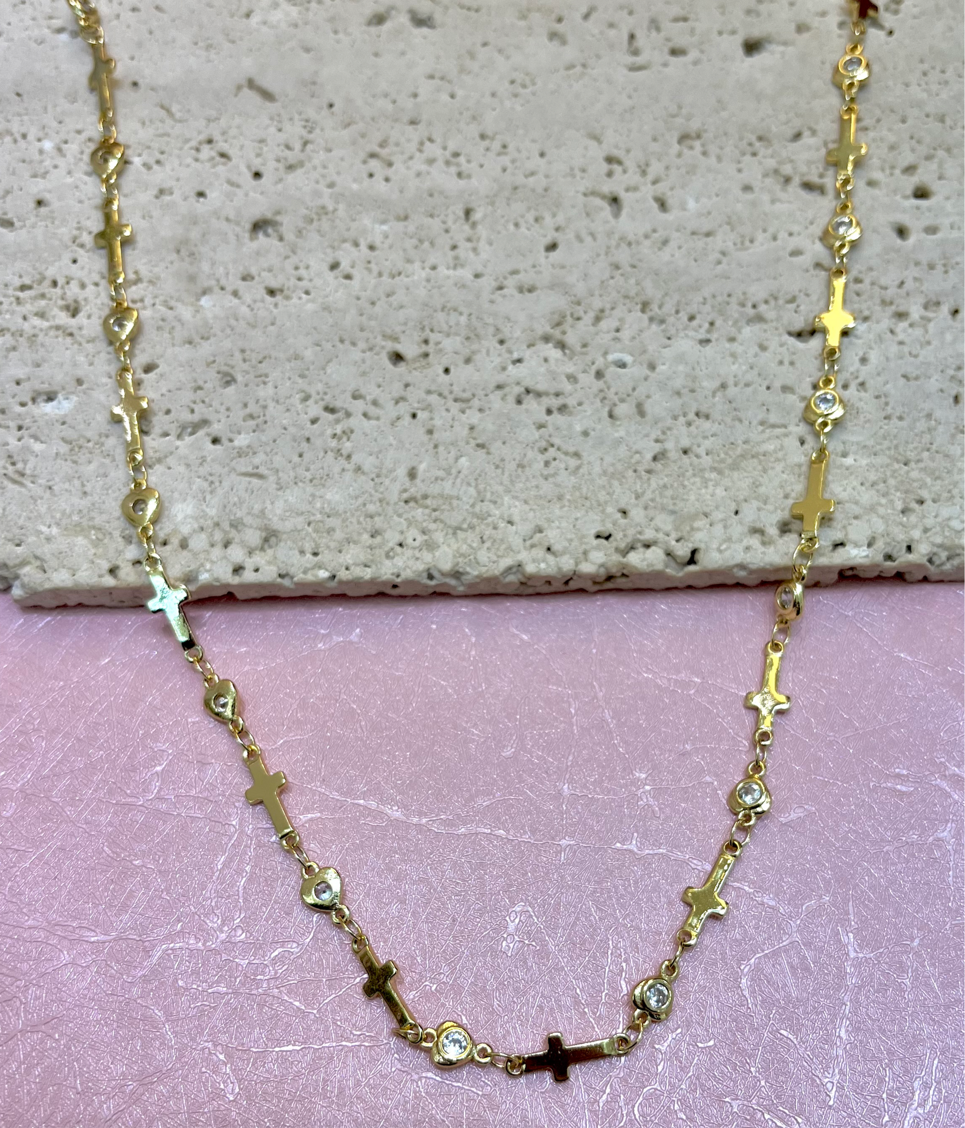 This chain has a beautiful mix of zirconia hearts and mini crosses. It is made with 18k gold plating over sterling silver. 15” + 2” extender.